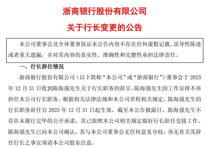 此前的2025年12月23日晚间,浙商银行公告称,根据中共浙江省委决定,吕临华任浙商银行党委委员、党委副书记,提名吕临华任董事、行长,提议陈海强不再担任行长职务。该行董事会将尽快按照法定程序完成相关工作。
