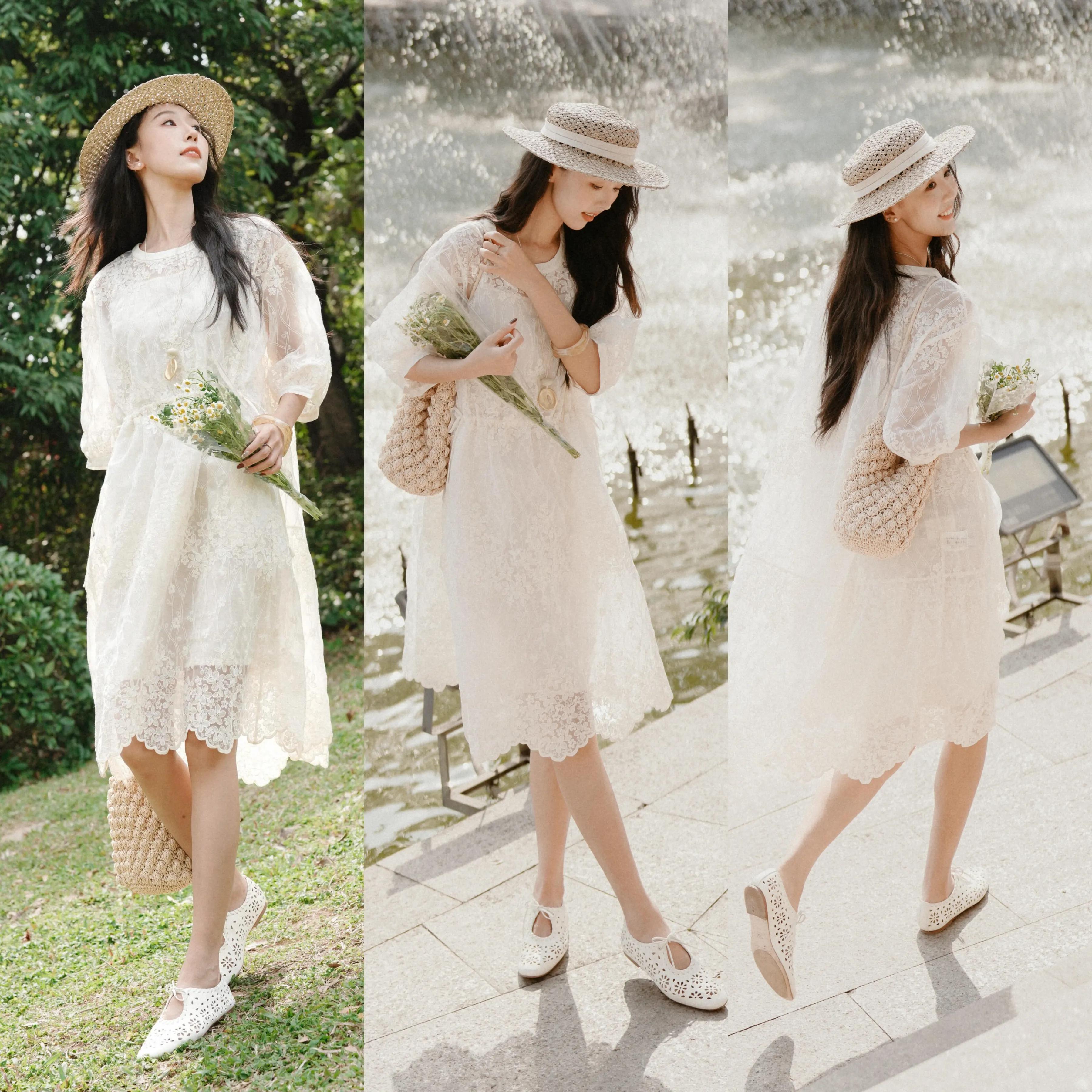或是选择一条镂空设计的蕾丝刺绣连衣裙,配上一顶草帽,脚踩白色平底单鞋,仙气飘飘,优雅得体又大方。