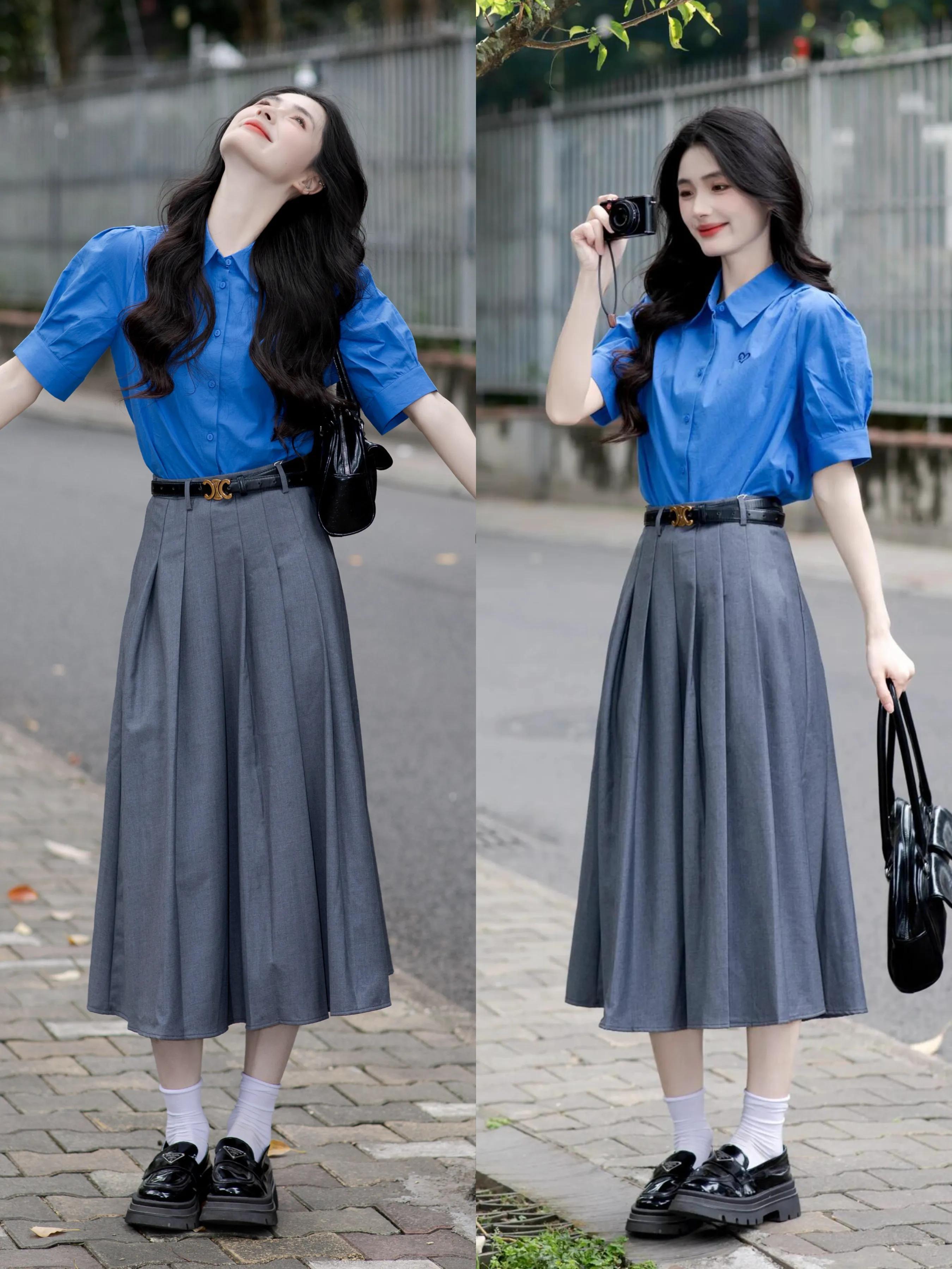 个子小巧,长相甜美的女生,不妨可以选择一件蓝色短袖衬衫配上灰色压褶半裙,脚踩一双黑色乐福鞋,结合优雅又俏皮的卷发造型,少女感扑面而来,有一种学院风的气质感。