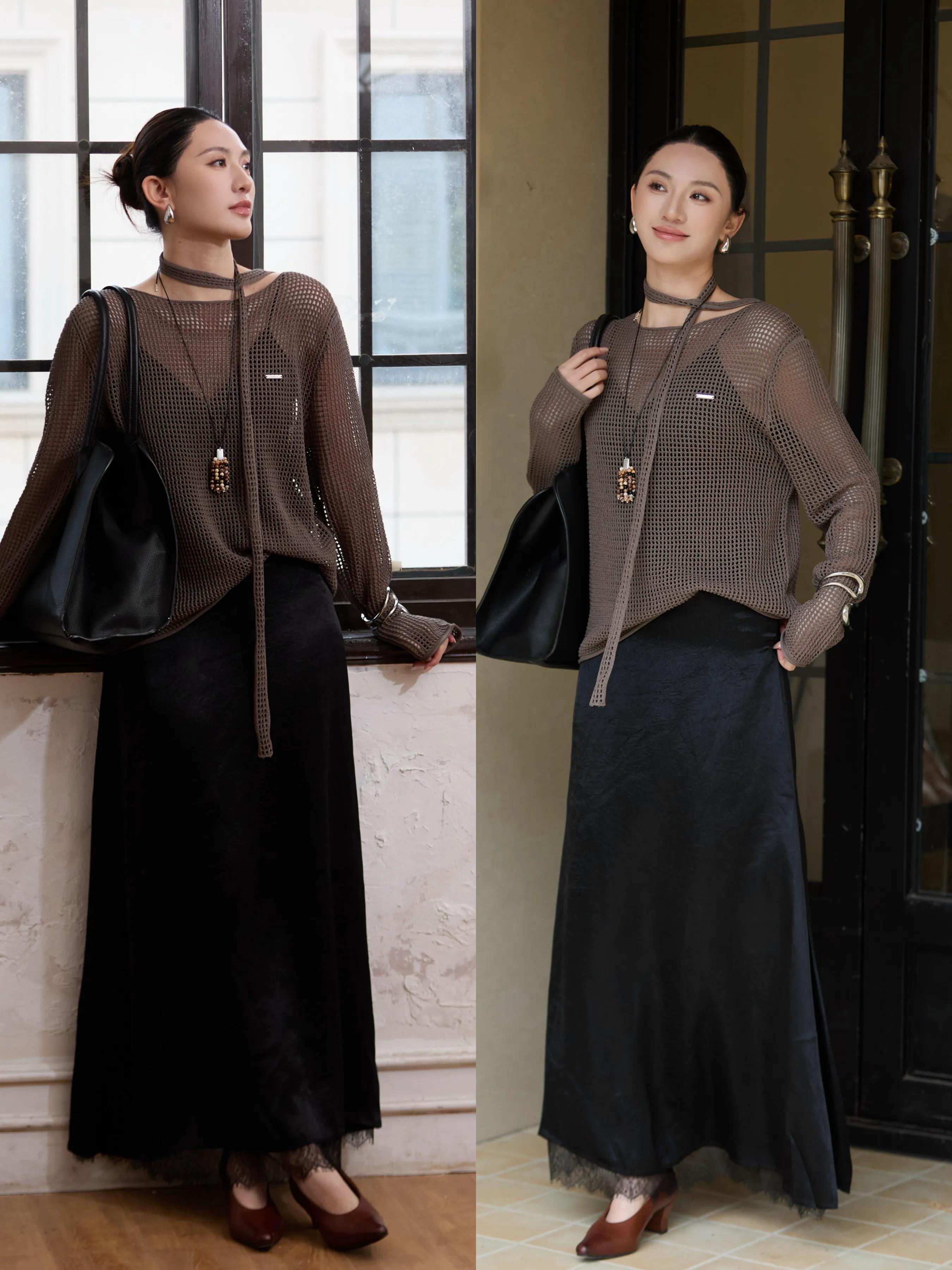 若是偏爱轻熟风、小姨风气质的穿搭风格,不妨用一件咖色的镂空设计上衣,内搭黑色小吊带,配上一条比较有品质感的黑色缎绸面料半裙,脚踩棕色粗跟单鞋,既沉稳又时尚。
