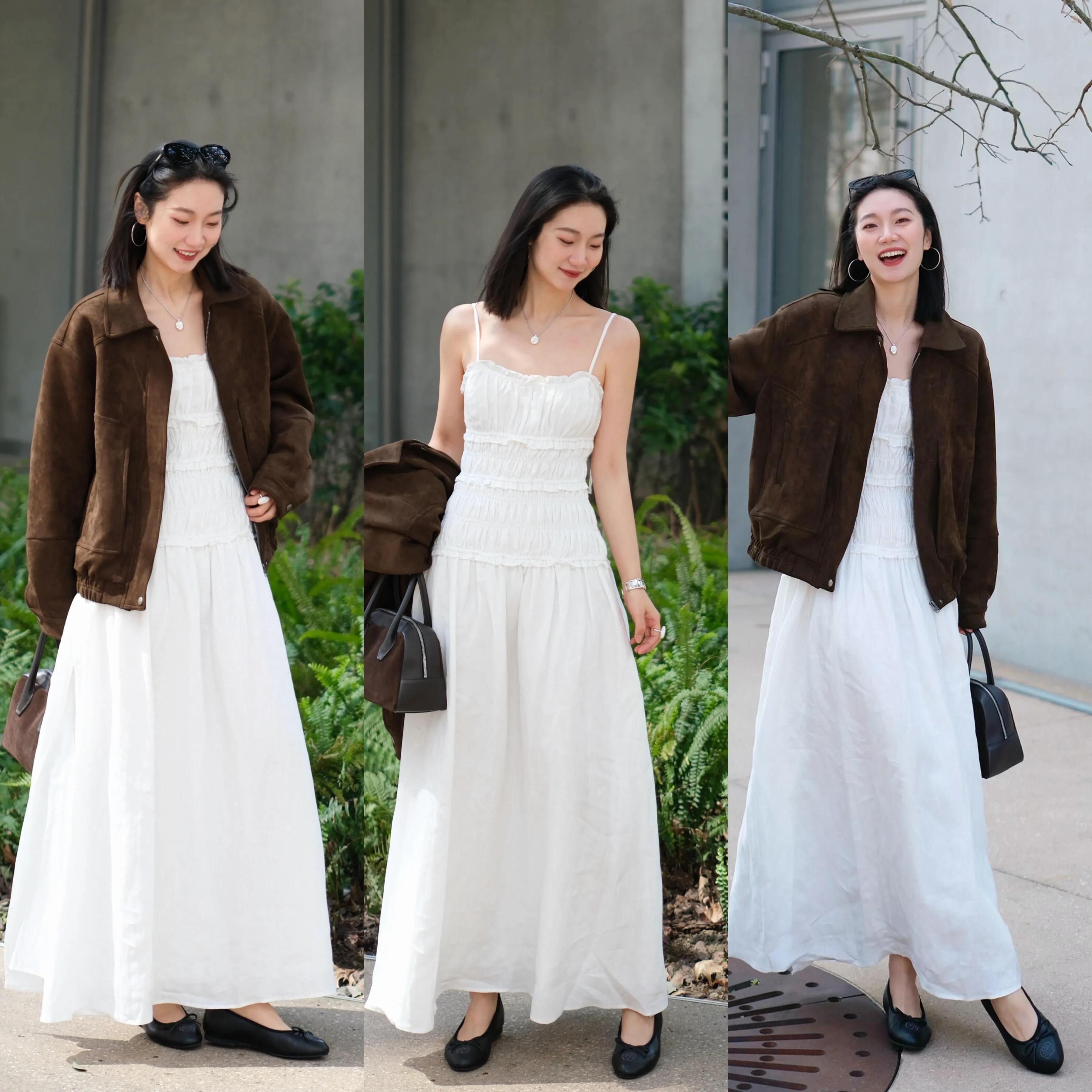 在这春暖花开的季节,若是出门旅游拍照想要更出片,我们可以穿的一条白色吊带连衣裙,呈现锁骨、天鹅颈和纤细手臂的优势,会更抢眼。也可以再披上棕色的夹克外套,形成外短内长的搭配,更容易形成高腰线,也更有层次感。