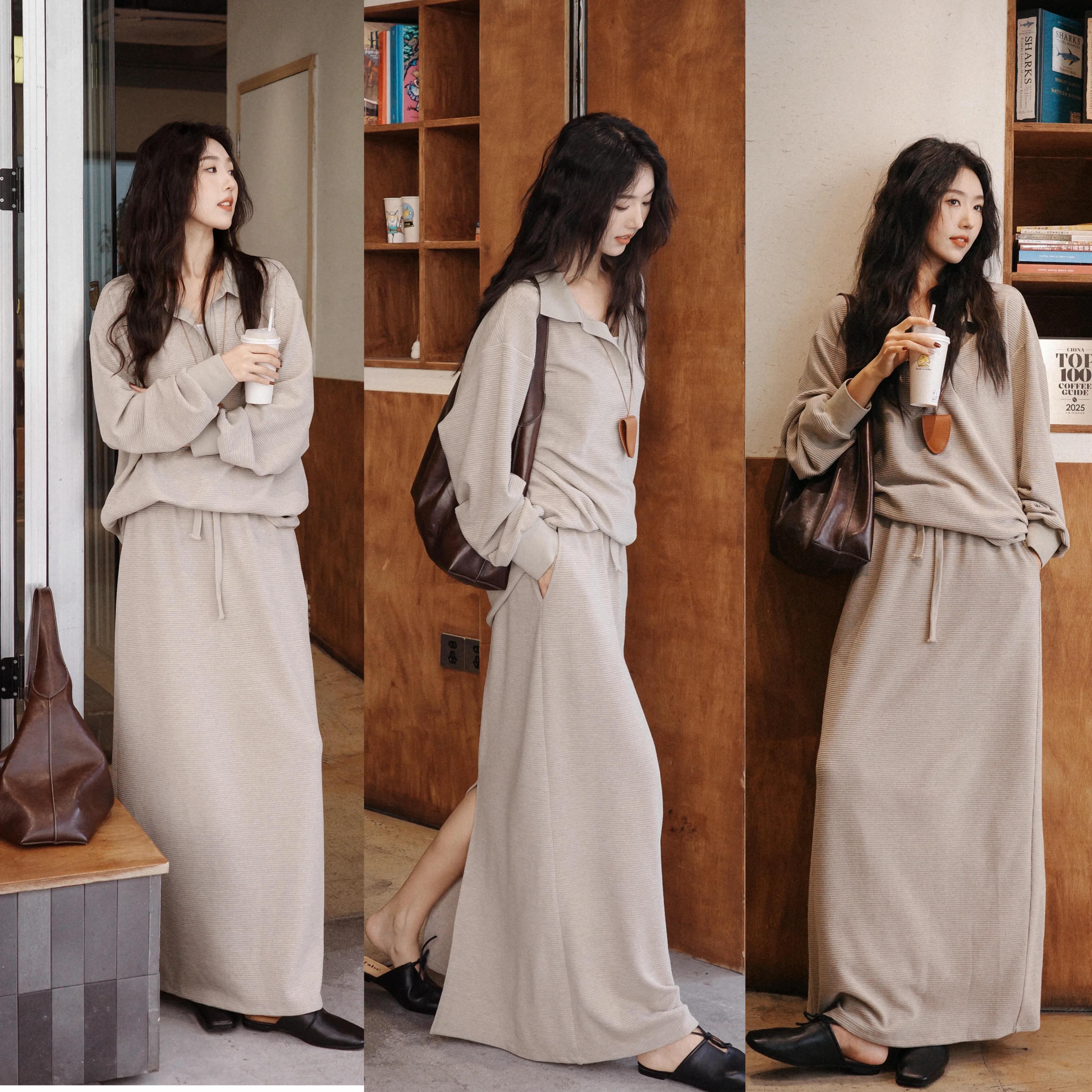不过衣服的版型很关键,上衣做了一个收腰的设计,可以形成高腰线,裙子面料很有垂坠感,穿在身上遮肉显瘦又显品质。
