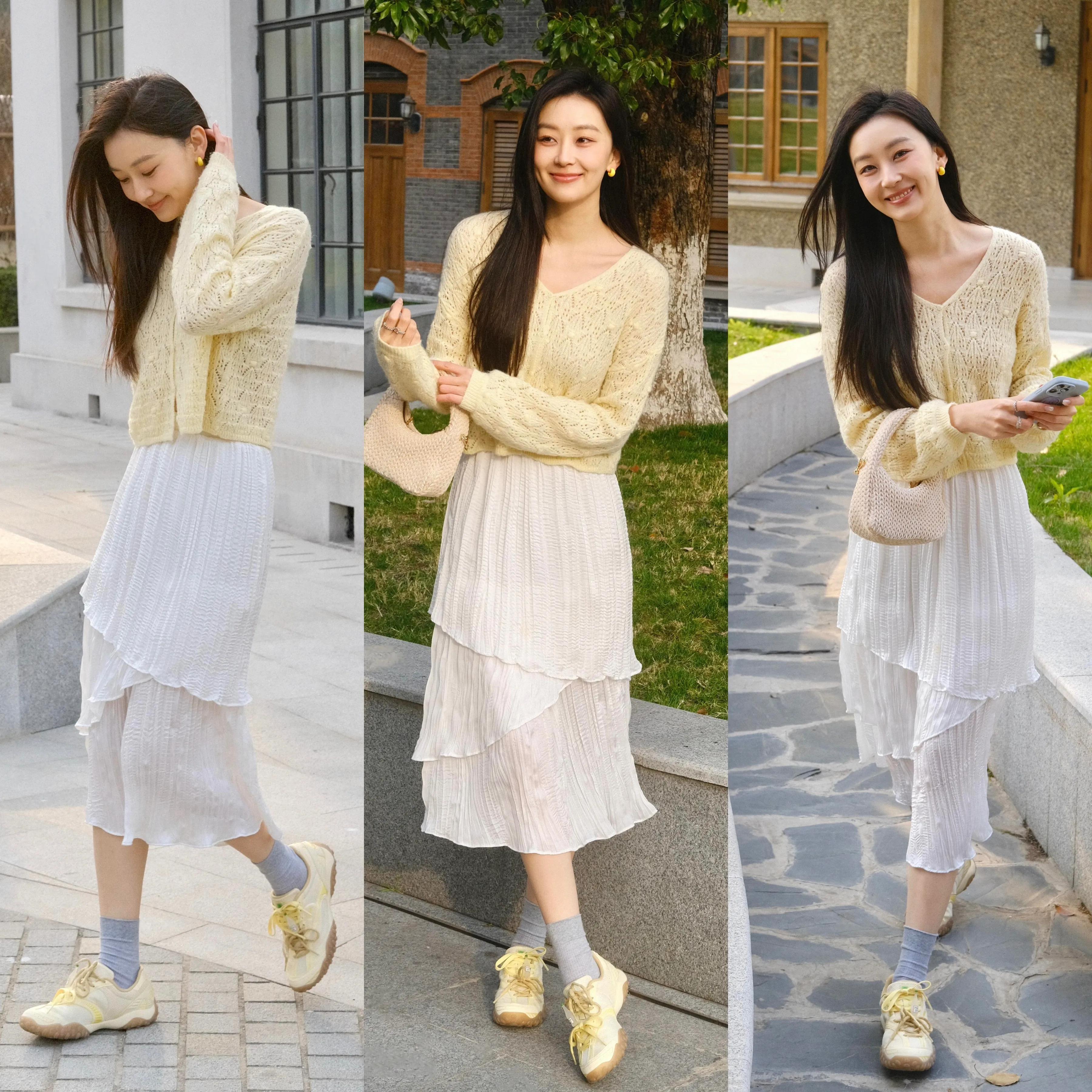 年龄不同,气质不同,穿衣风格就有差异。个子小巧,想让自己的穿搭更温柔,不妨可以选择浅鹅黄色的针织开衫配上白色半裙,脚踩鹅黄色的老爹鞋,正好和上衣色彩形成呼应,既俏皮又洋气,这样的打扮谁穿谁好看。
