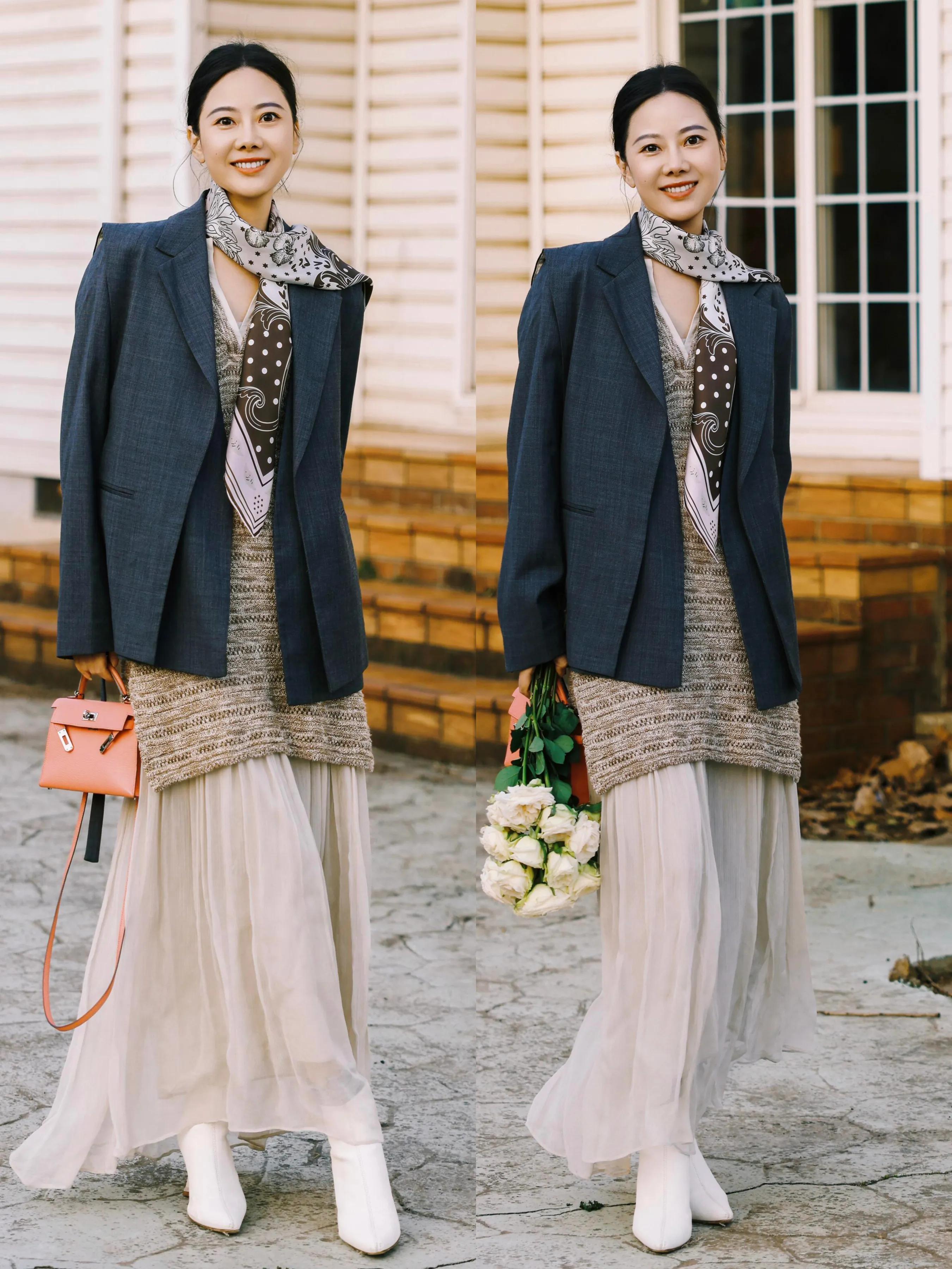 第二章节:裙子长一点更优雅Tips①:灰色西服+薄纱伞裙
