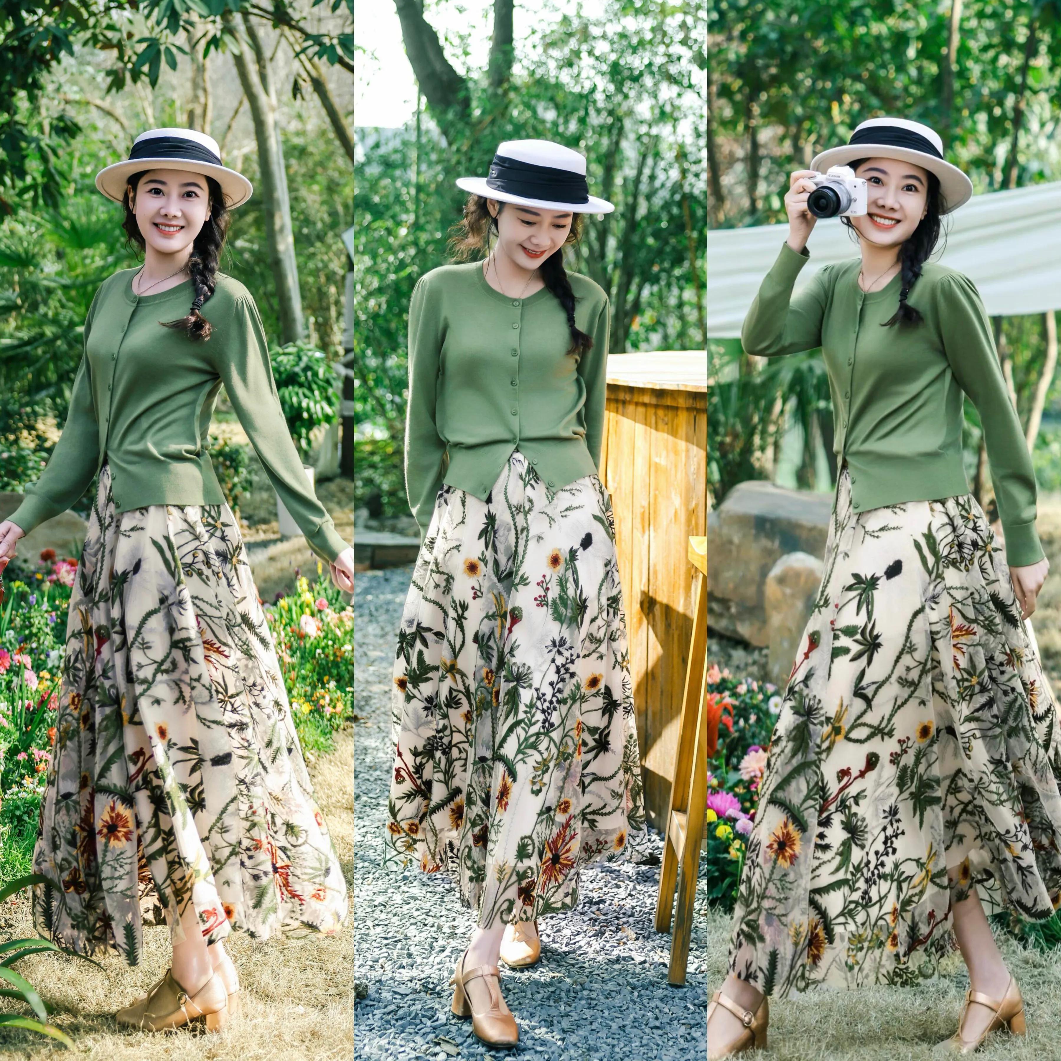 春暖花开的季节,去公园拍照想要更出片,不妨可以选择一件绿色的针织开衫,搭配上印花的伞状半裙,脚踩一双粗跟单鞋,这样的穿搭属于繁简结合搭配,能解决穿衣配色过于单调问题。