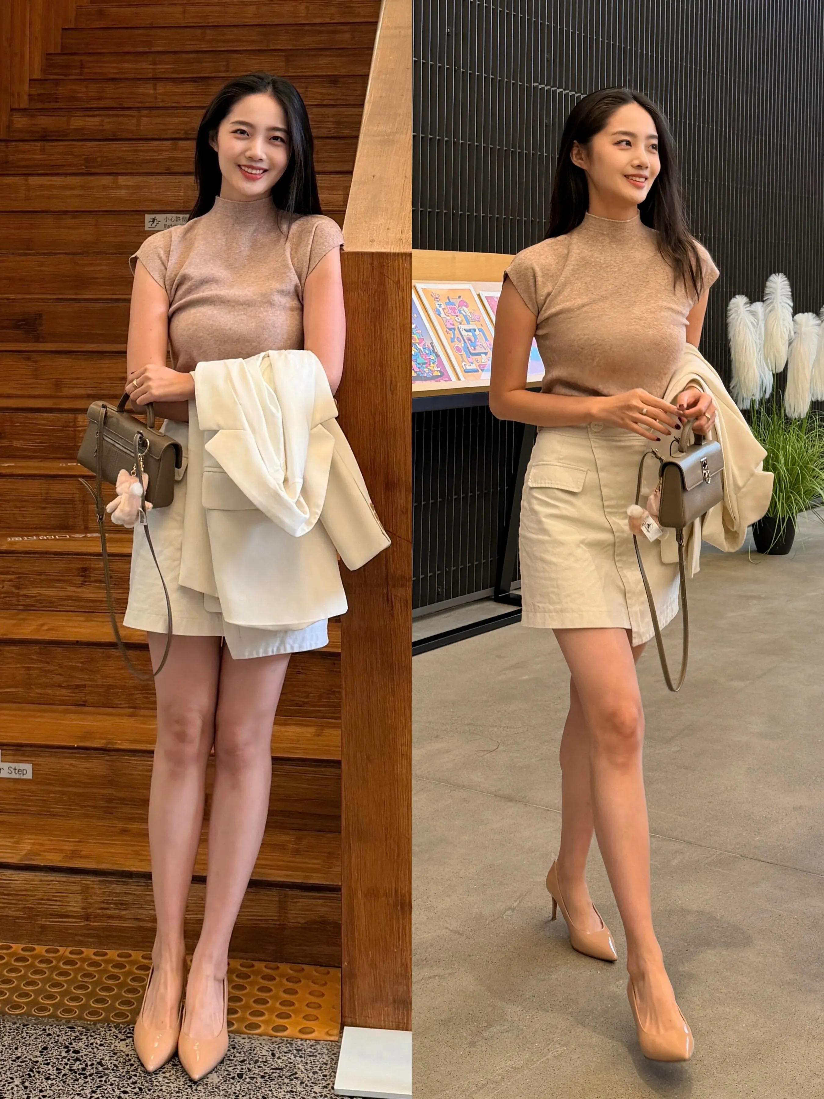 或是选择卡其色西服配上断层面料白色直筒半裙,干练又优雅,通勤时髦。
