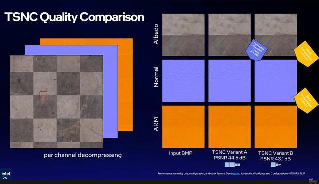在性能方面,英特尔在最新的 “Panther Lake” 平台上对 TSNC 技术进行了基准测试,测试平台搭载集成 Arc B390 显卡,并配备用于加速 AI 工作负载的 XMX 核心。在该平台上,AI 模型生成首个纹理像素的耗时约为 0.194 纳秒,足以保证游戏在实时渲染时不会出现额外延迟或明显异常,保持画面流畅输出。英特尔表示,TSNC 技术预计将在今年晚些时候以 Alpha 版本形式向外发布,后续还将推出 Beta 版本和正式稳定版,不过目前尚未给出具体时间表。