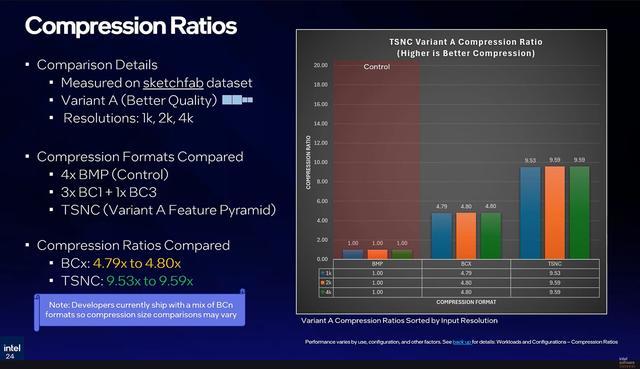 英特尔为 TSNC 设计了多种应用侧重点不同的使用方案,可根据开发者诉求在安装包体积、显存占用和运行性能之间进行取舍。其中,被称为 Variant A(A 方案)的模型可以在画质几乎无感下降的前提下,将标准纹理集压缩至原来的约 1/9,肉眼难以分辨差异。若以效率最大化为目标,英特尔则提供 Variant B(B 方案),在体积压缩最高可达 18 倍的同时,带来更明显的性能提高,但会引入一定程度的画质变化。